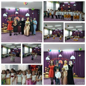 26.10.2018В октябре 2018 года в музыкальном зале детского сада №32 "Машар"прошел осенний праздник: «Золотая осень в гости к нам пришла». В гости к детям пришли сказочные герои: красавица Осень, хитрая Лисичка и наивный Кот Базилио. Ребята на протяжении всего утренника активно сотрудничали, как друг с другом, так и с героями, которые пришли к ним на праздник. Дети принимали активное участие во всех номерах утренника: выразительно читали стихи, задорно танцевали, эмоционально исполняли песни, отгадывали загадки. Из наблюдений и разговора с ребятами и родителями видно, что воспитанникам на утреннике было весело и интересно,а родители получили огромный заряд позитивной энергии.